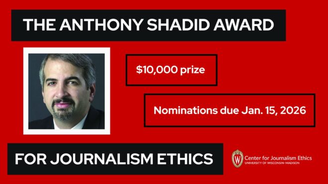 The Center for Journalism Ethics at the University of Wisconsin-Madison seeks nominations for the 2026 Anthony Shadid Award for Journalism Ethics.